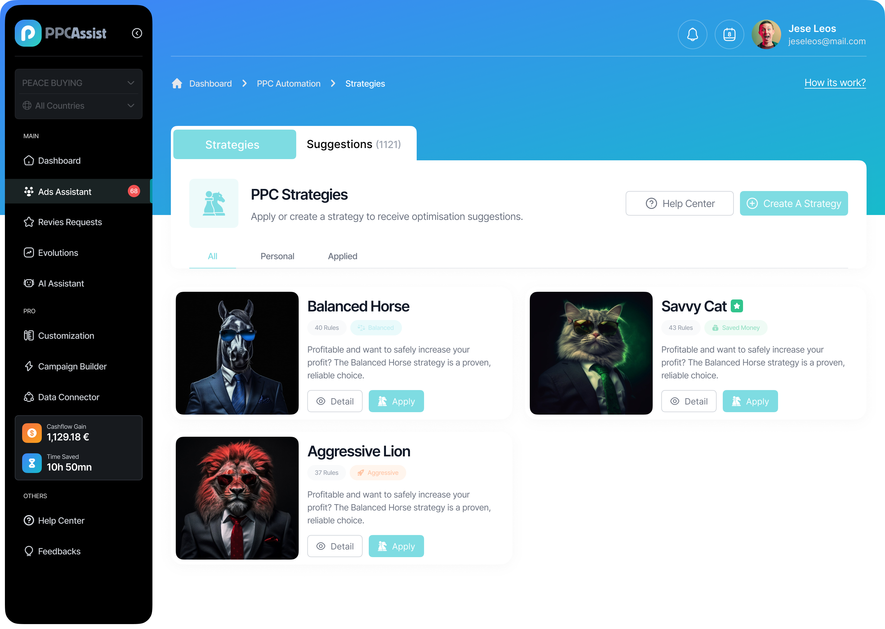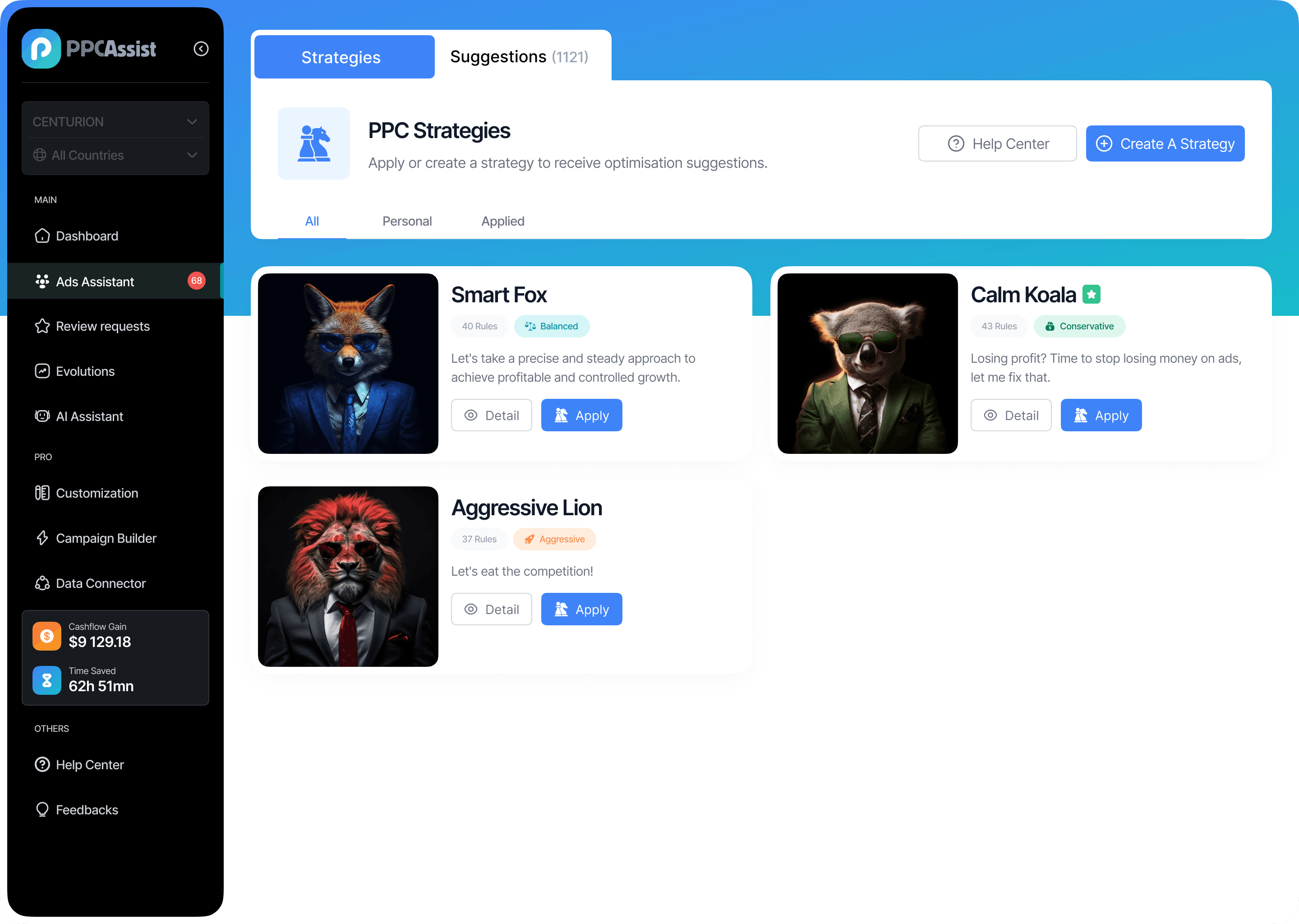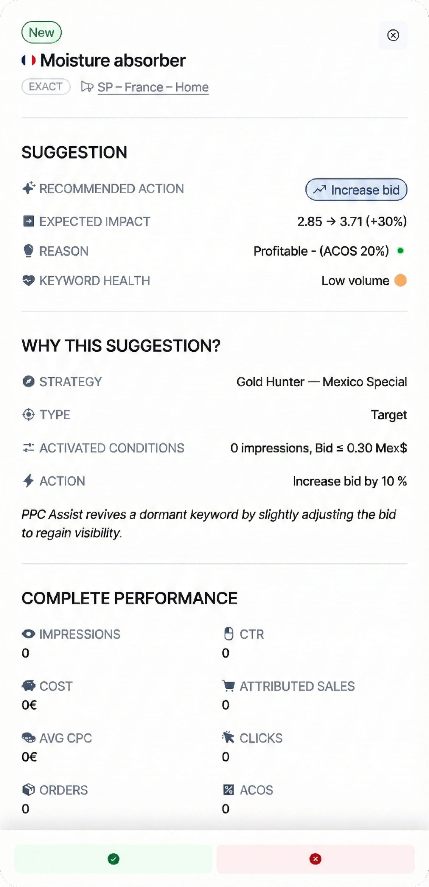 It’s hybrid. PPC Assist is rule-based at its core, with ready-to-use strategies and a fully flexible strategy builder (keyword harvesting, negative targeting, bid adjustments, placement adjustments, and more). On top of that, our AI Assistant provides recommendations — but it never runs your ads or applies changes automatically.